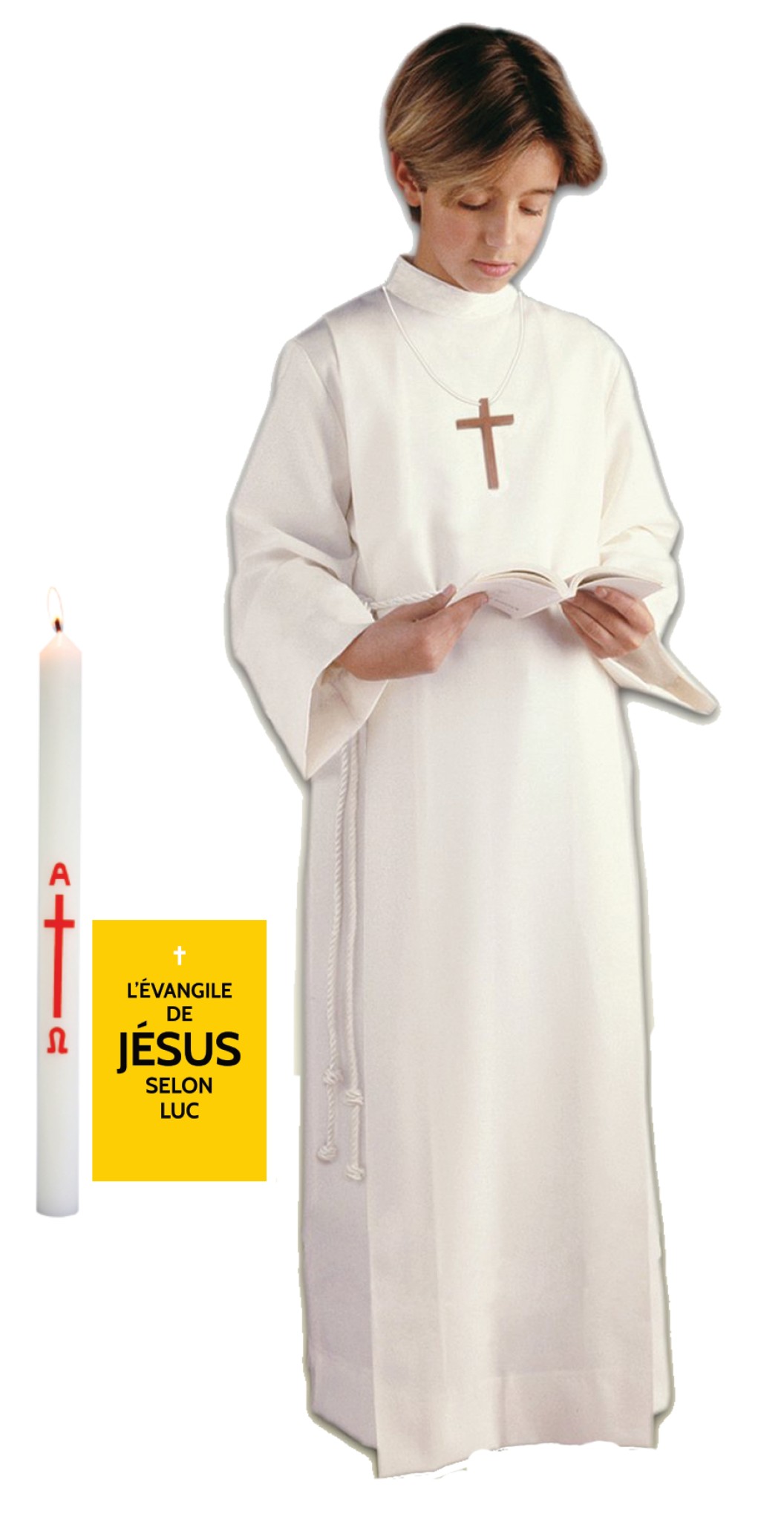 Pack qui comprend une aube pour enfant (124 cm) à cordon (100 % polyester), un cordon, une croix en bois à cordon, un cierge à motif et l'évangile de saint Luc